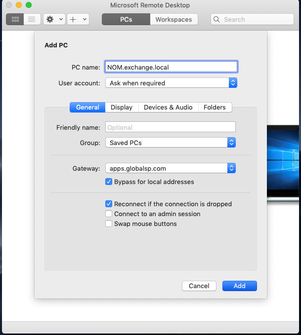 Etape 6 : Dans l’onglet « PCs » de Microsoft Remote Desktop vous cliquer sur « Add PC ».